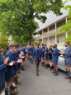 Dado que, ya hemos visto las diversiones de la Paarl Boys, vayamos a ver la parte oficial, la que hace que haya estudiantes con rango, una plaquita en la solapa de sus chaquetas del uniforme, eso es, a base de gran trabajo y constancia, buenas notas y capaz de poder ayudar a los más pequeños, los de Grado 000,00,0 antes, lo que para España o Europa sería la parte de Pre-escolar, o Kinder lo que sea en cada sitio, y allí eso significa que son niños que entran en la escuela internados, y que allí aprenderán a ser autónomos, integrarse es, parte esencial, lejos de casa, sin las madres, y aprender muchas cosas habituales, hacerse la cama, tener la habitación recogida, limpia, el aseo, y los horarios de la escuela, los mayores de Grado 12 y 13 se encargan de poder ayudar a éstos nuevos alumnos a integrarse, y eso es una costumbre a todas y cada una de las escuelas en Sudáfrica como éstas, de pago.El Estado sudafricano, beca a los niños de color, que antes no podían entrar aquí, antes de 1991, niños de zonas más pobres que pueden y tienen demostrado que pueden ser buenos estudiantes y que pueden sobrevivir en un medio hostil, los primeros chicos de color en esos colegios, pasaron un gran infierno, ahora ya es diferente, por que hay muchos más.Éste acto, que veréis a continuación es un acto que se da casi a final de curso, se les reconoce ese mérito y les hacen un pasillo, y ellos pasan por ese pasillo, espectacular desde luego es :